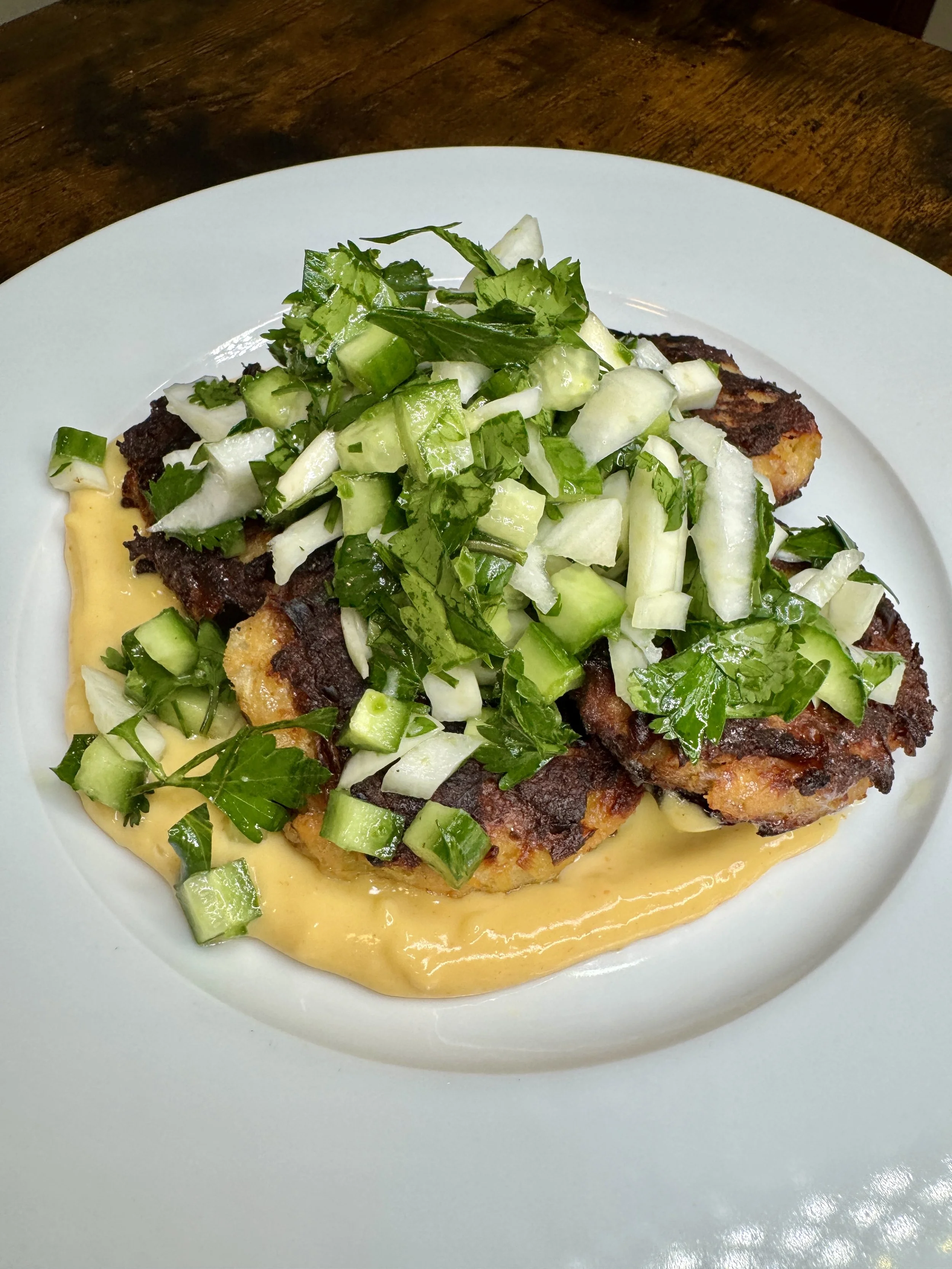 Étendre une belle portion de mayonnaise dans le fond de votre assiette de service, déposer des croquettes de saumon et finir avec une généreuse portion du mélange de fenouil, de concombre et d’herbes fraîches!